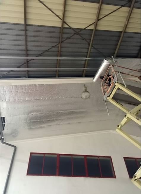 שכבת בידוד רפלקטיבית מותקנת על תקרת הפנים של מחסן Alcamen התקנת בידוד רפלקטיבי על מבנה תקרת פנים במחסן Alcamen